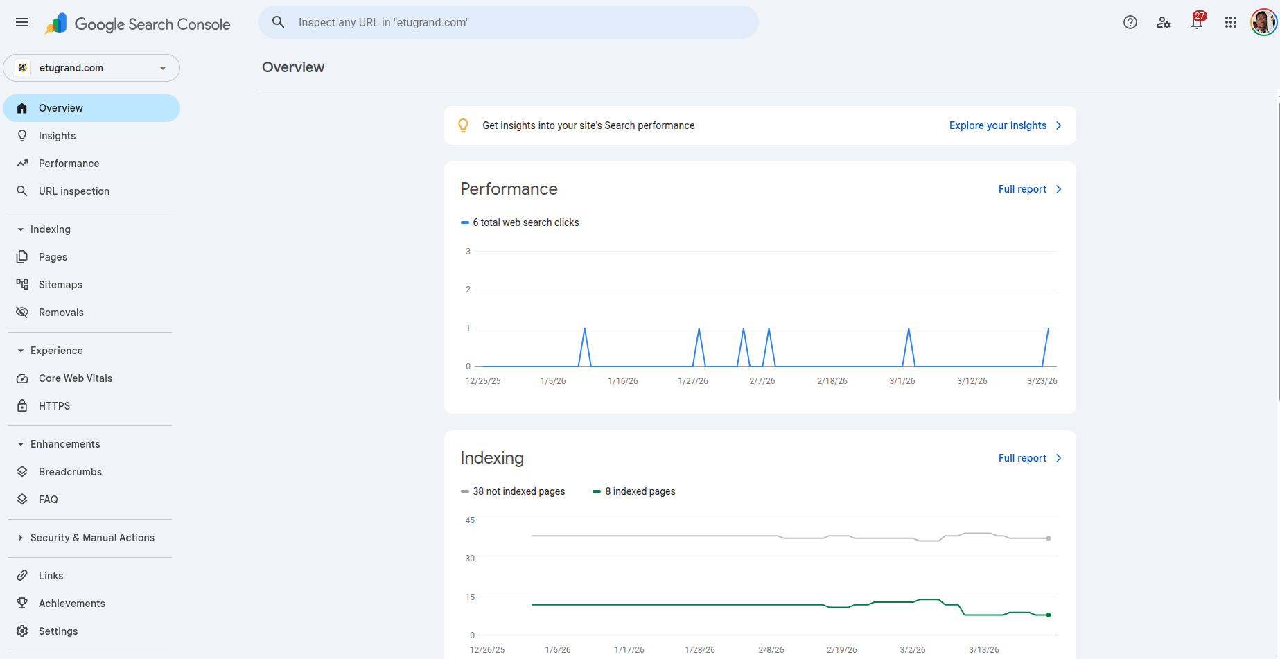 How to use it: Use Insights as a quick pulse check. Then validate decisions in the Performance and Pages reports, where the underlying data is more detailed.