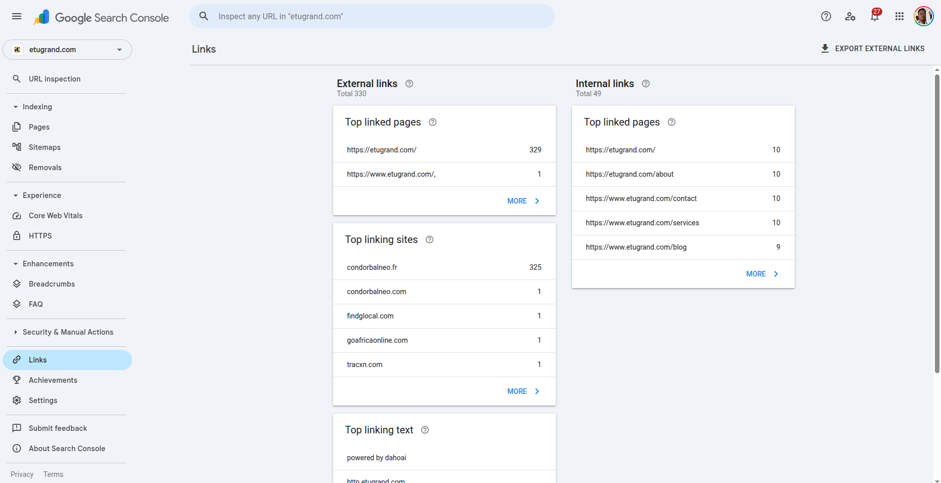 - Top linking sites: External domains that link to you the most